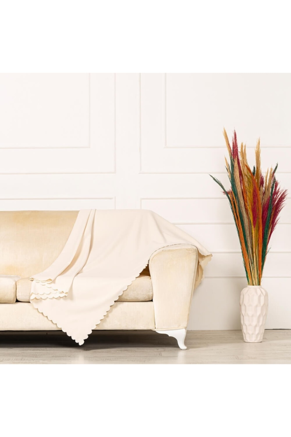 Ekru Renk Dokuma Kadife Şönil Düz Kumaş Çift Taraflı Standart Koltuk Şalı