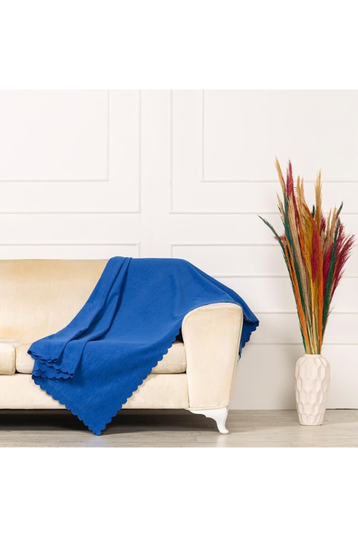 Saks Mavi Dokuma Kadife Şönil Düz Kumaş Çift Taraflı Tekli Koltuk Şalı