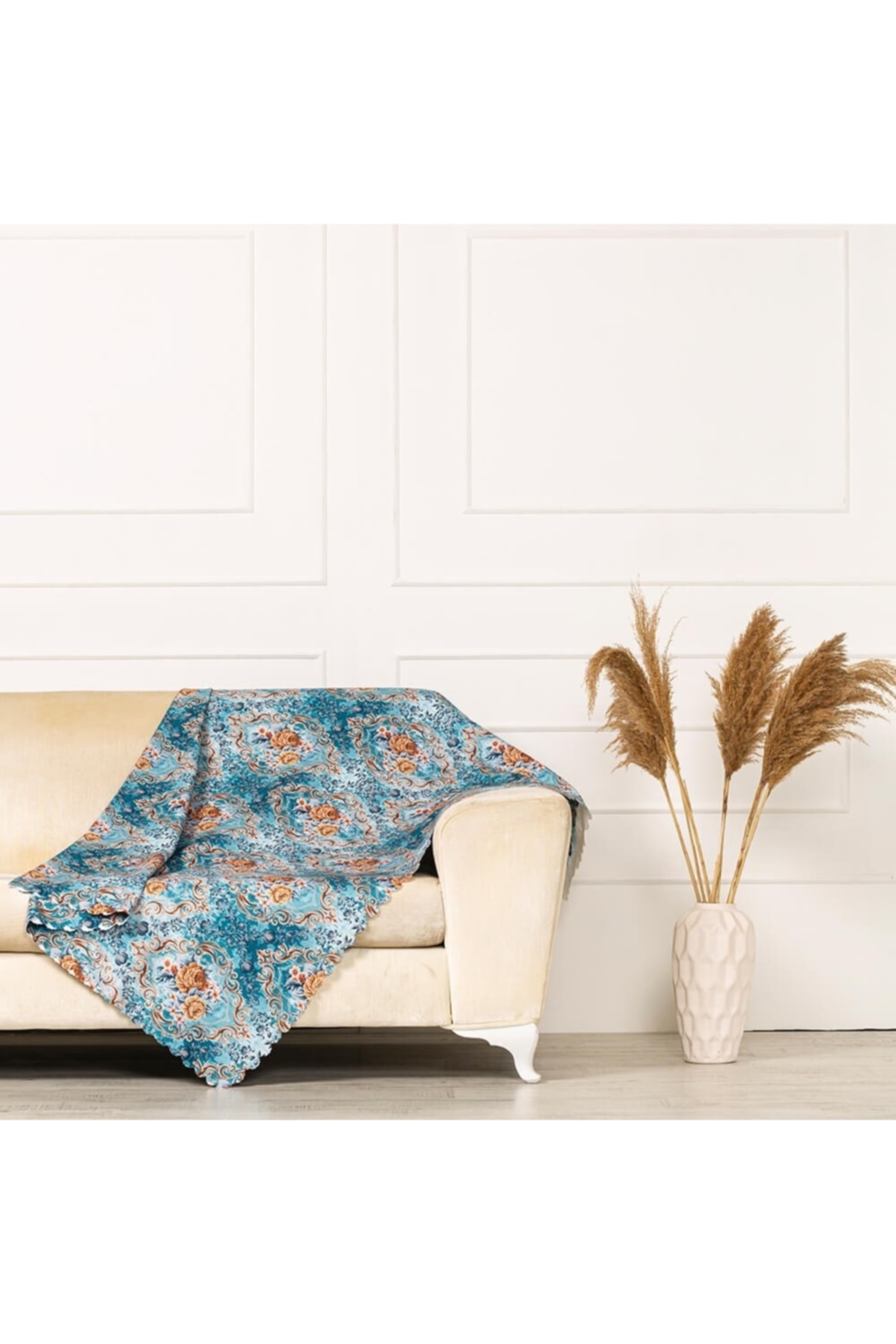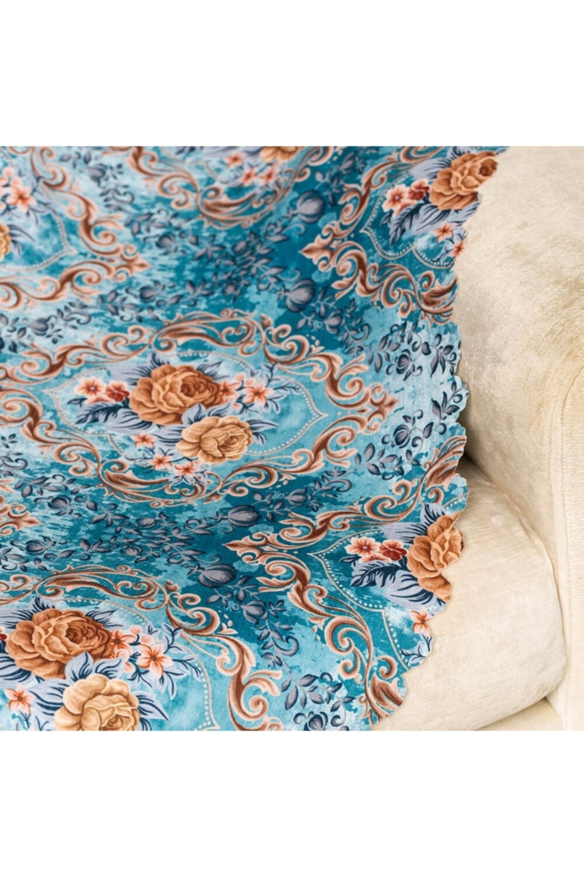 Mavi Zemin Efektli Modern Damask Desen Dokuma Kadife Dijital Baskılı Standart Koltuk Şalı