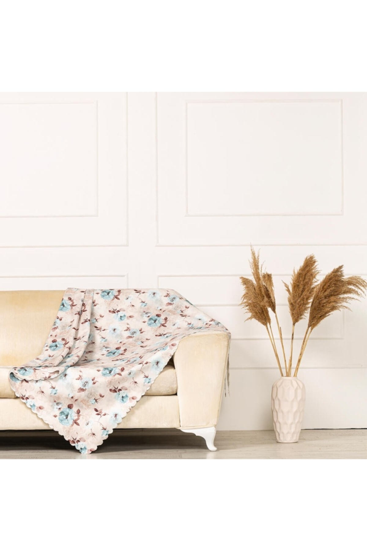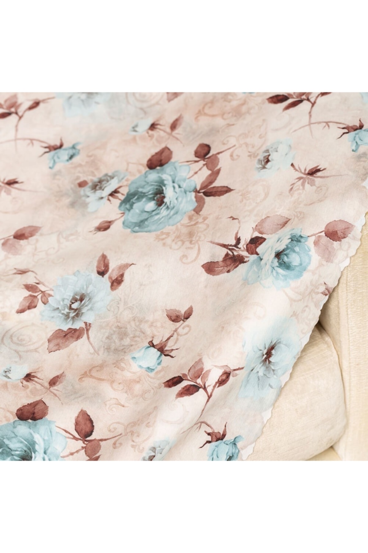 Turkuaz Kahve Renkli Gül Desen Dokuma Dijital Baskılı Kadife Şönil Koltuk Şalı Örtüsü Battal Boy 175