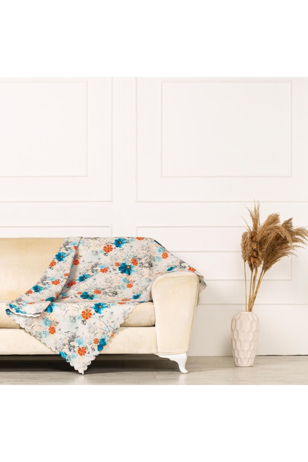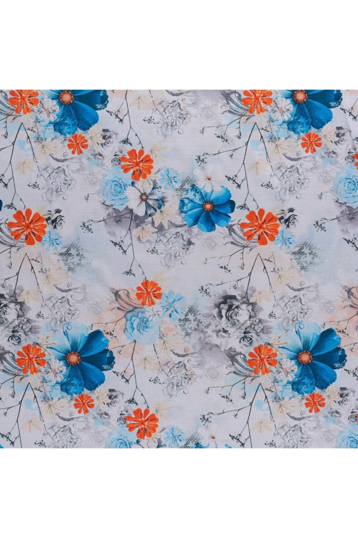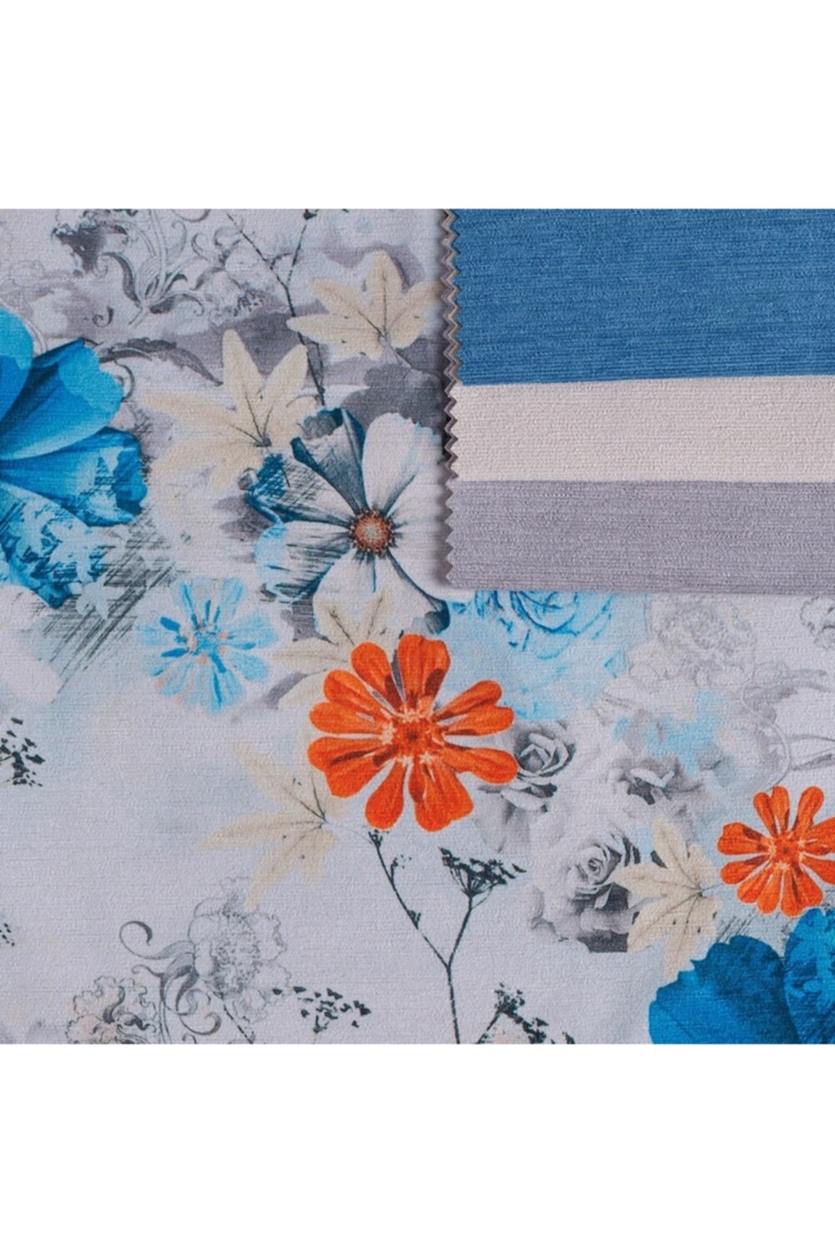 Mavi Turuncu Renkli Çiçekli Dokuma Dijital Baskılı Kadife Şönil