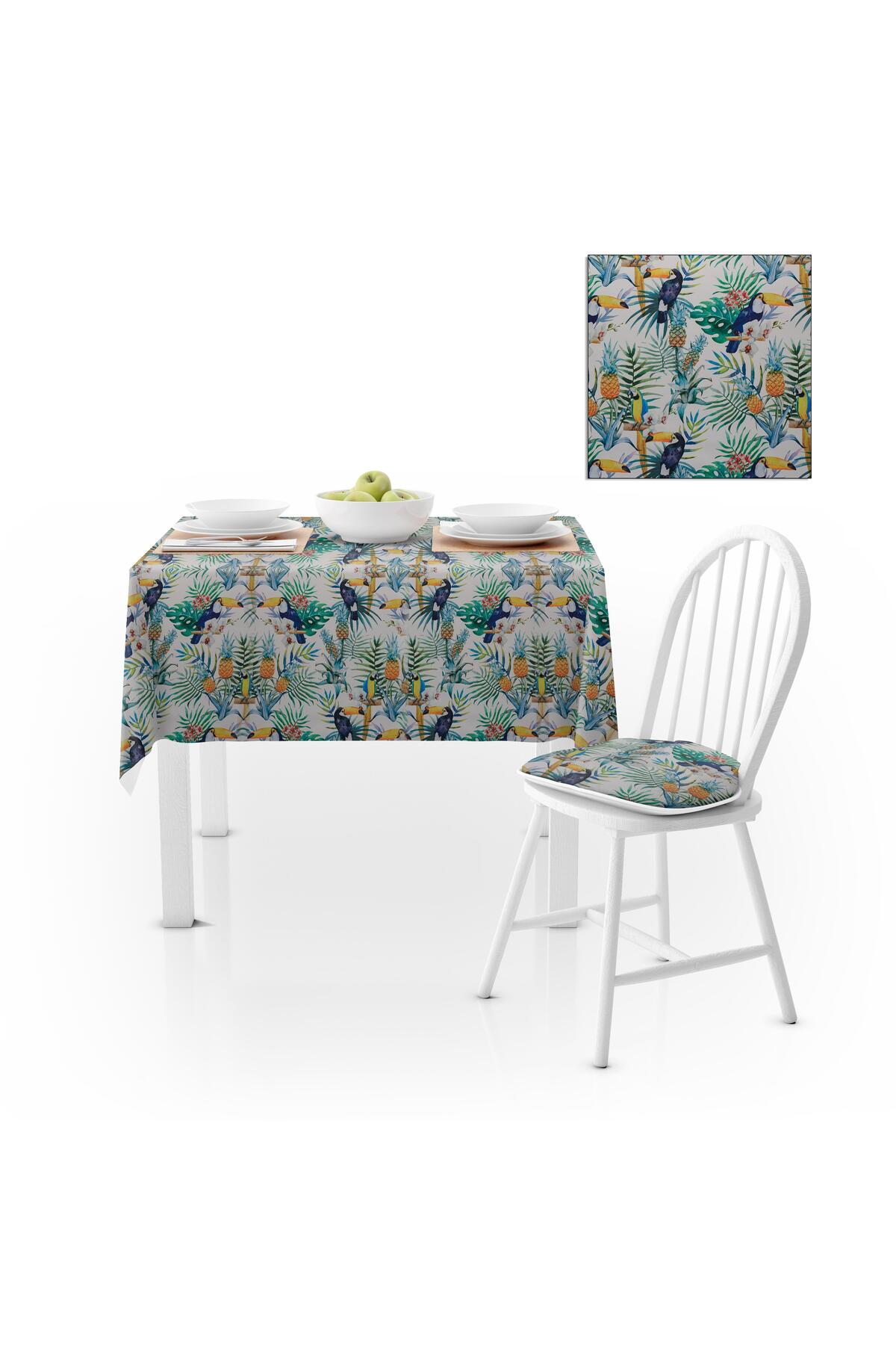Polyester kumaş yapısı sayesinde uzun ömürlü kullanım ve kolay temizlik imkanı sunar; Tropikal papağan yaprak desenleriyle süslenmiş çiçekli tasarım, masanızda doğal bir atmosfer yaratır; Dikdörtgen formu, çeşitli masa boyutlarına uyum sağlayarak pratik bir kullanım olanağı tanır;