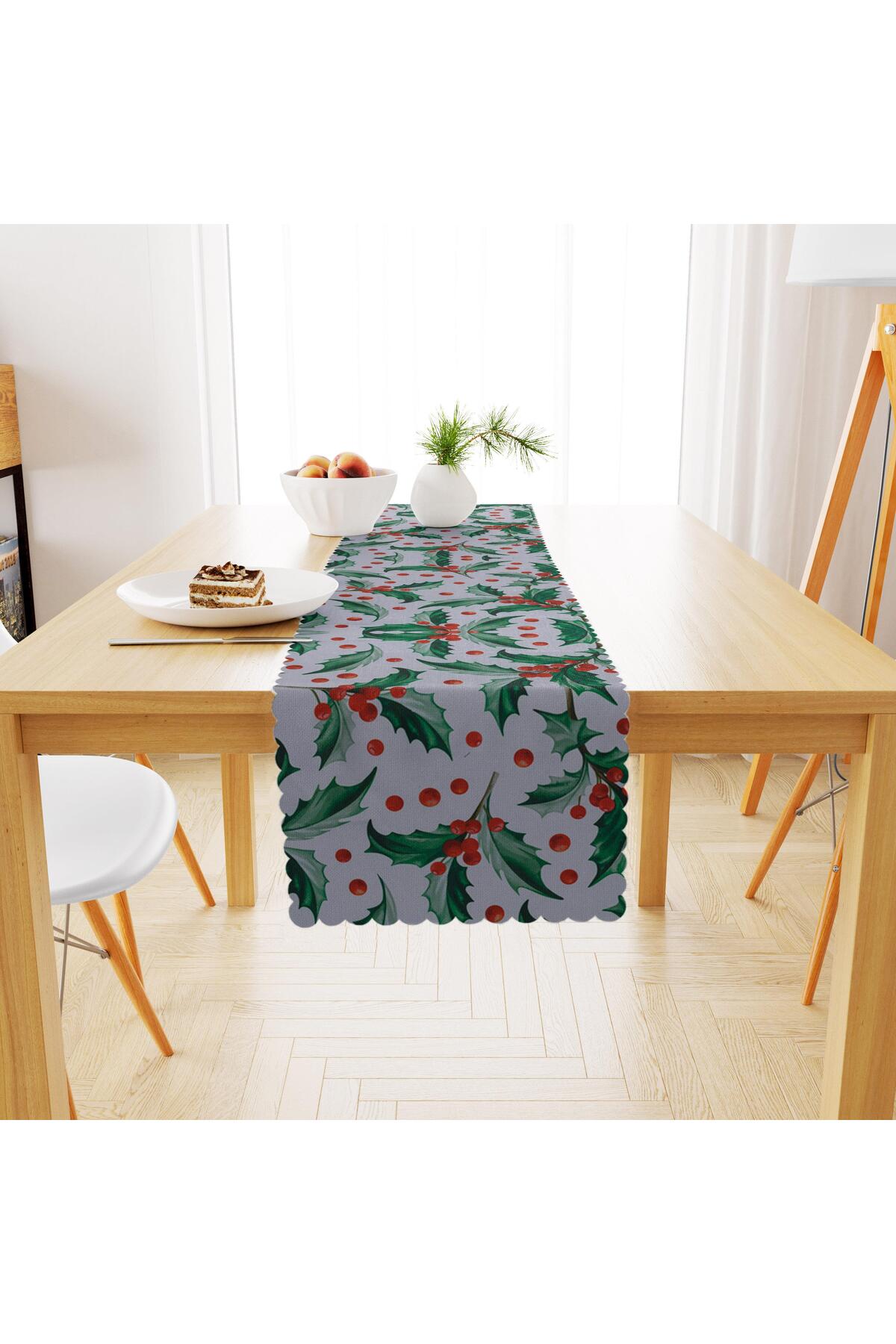 Kızılcık Desenli Yeşil Yapraklı Dijital Baskılı Petek Dokuma Runner 40x140