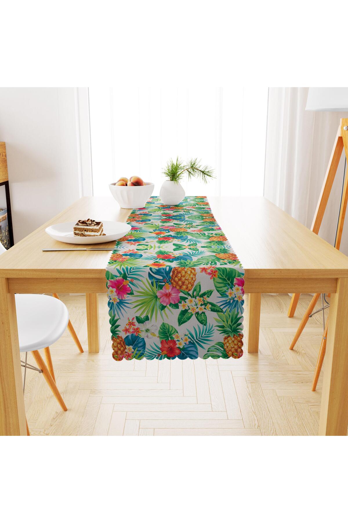 Palmiye Yapraklı Tropikal Ananas Desenli Beyaz Zemin Yeşil Dijital Baskılı Petek Dokuma Runner 40x14