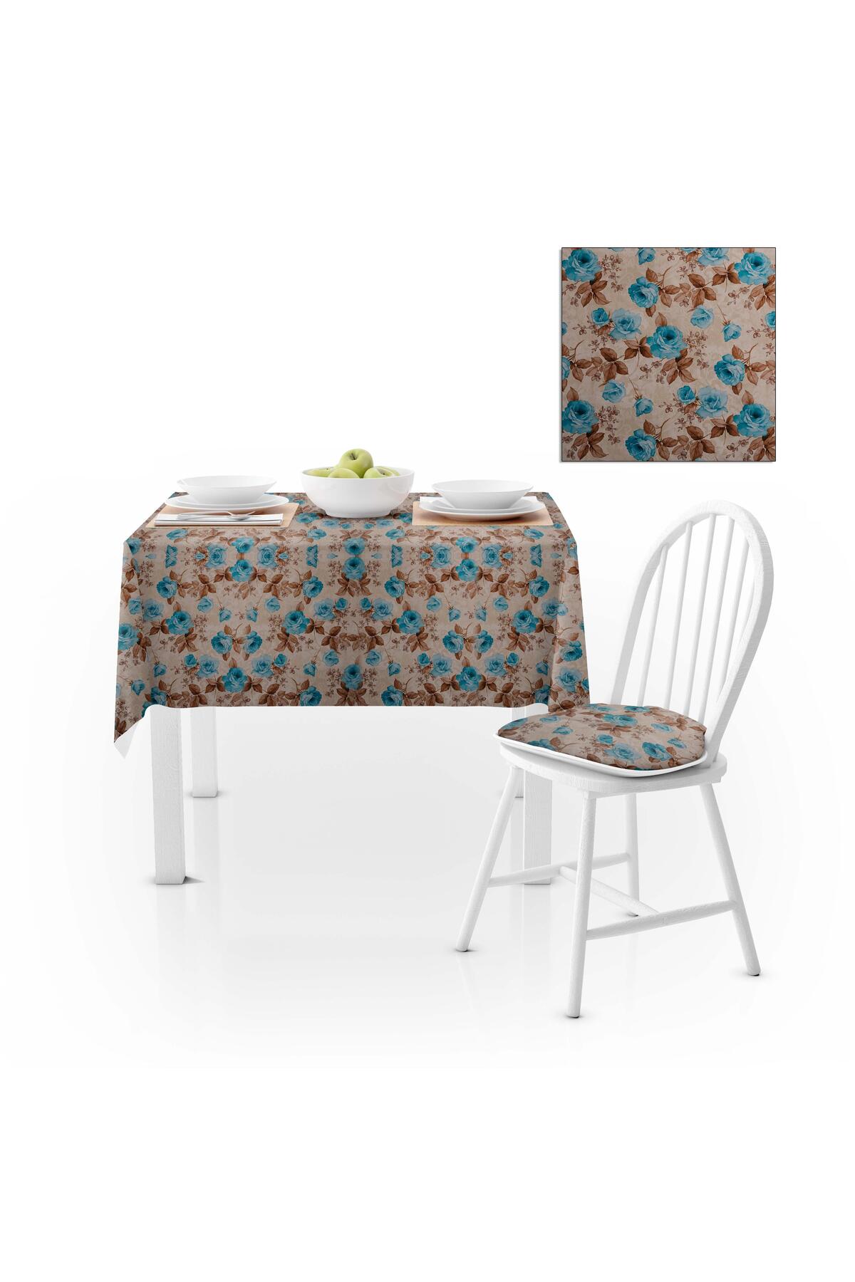 Gül Desenli Çikolata Yapraklı Krem Turkuaz Dijital Baskılı Süet Dokuma Masa Örtüsü 140x180