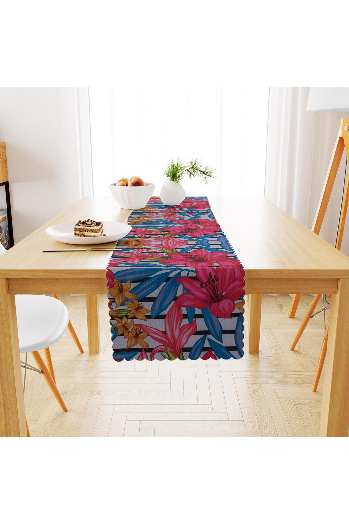 Zambak Desenli Mavi Kırmızı Dijital Baskılı Petek Dokuma Runner 40x140